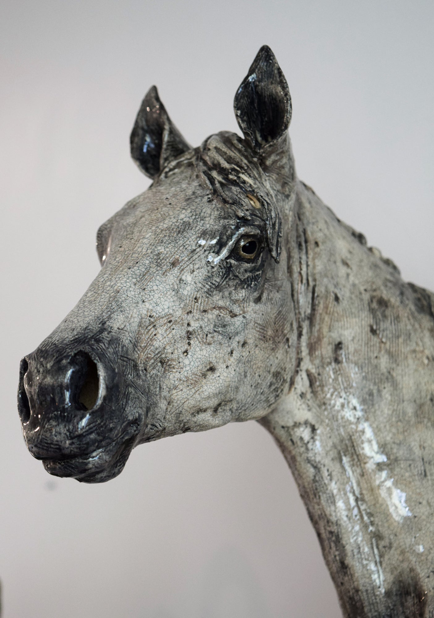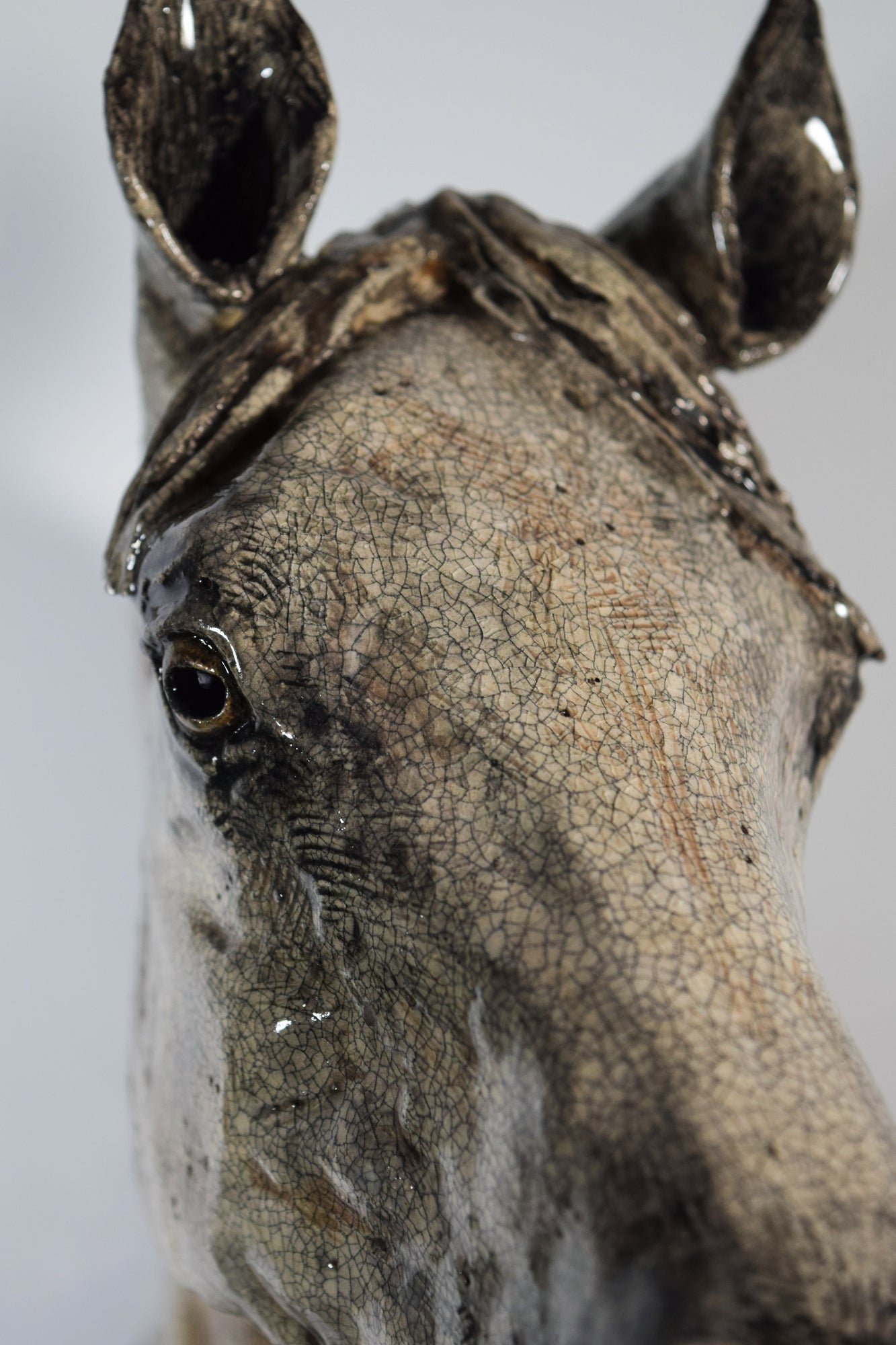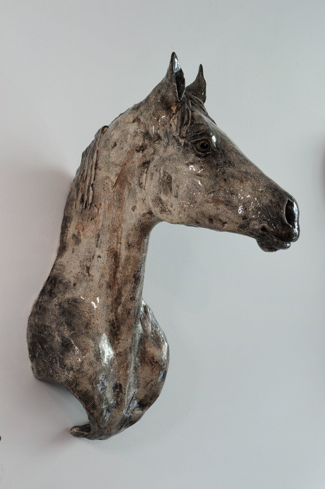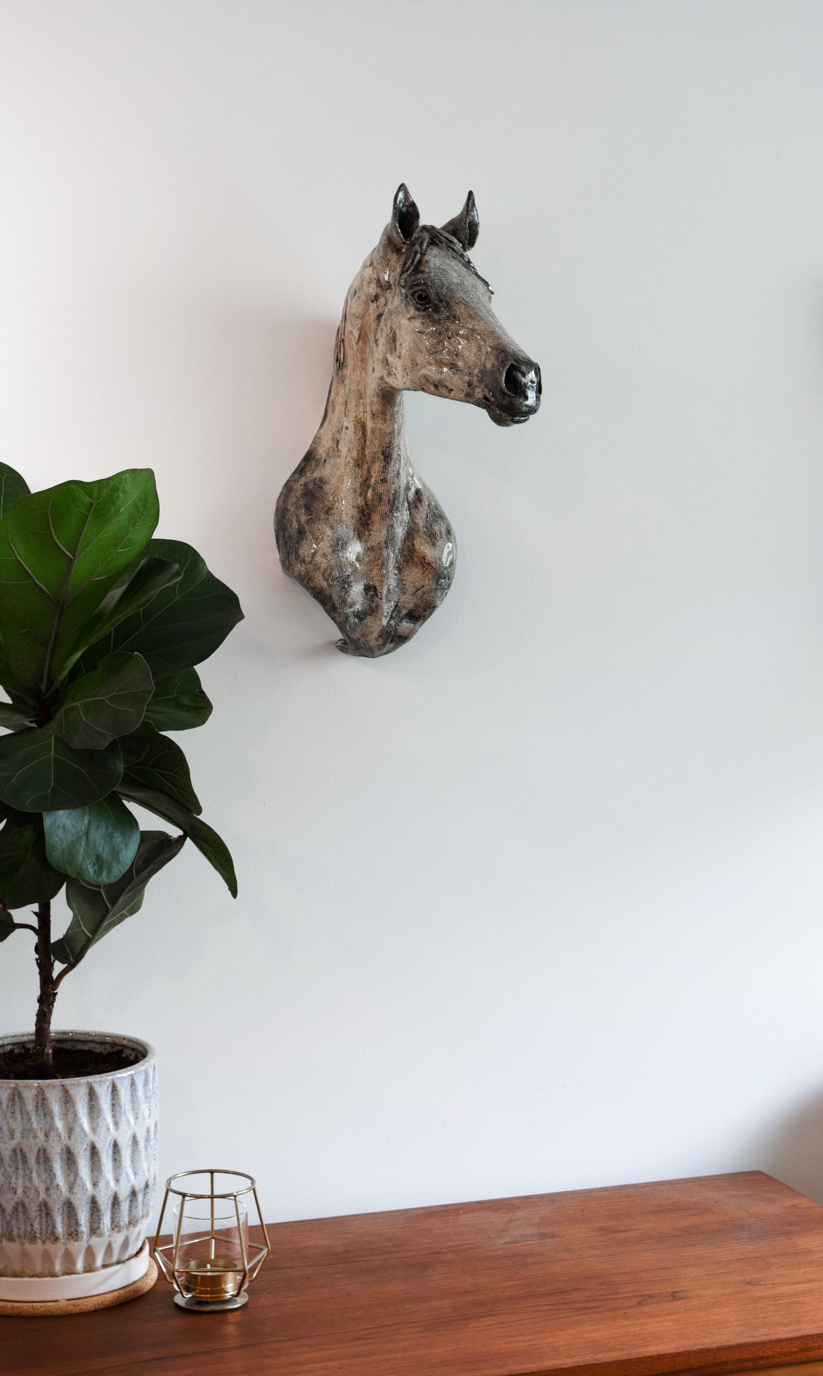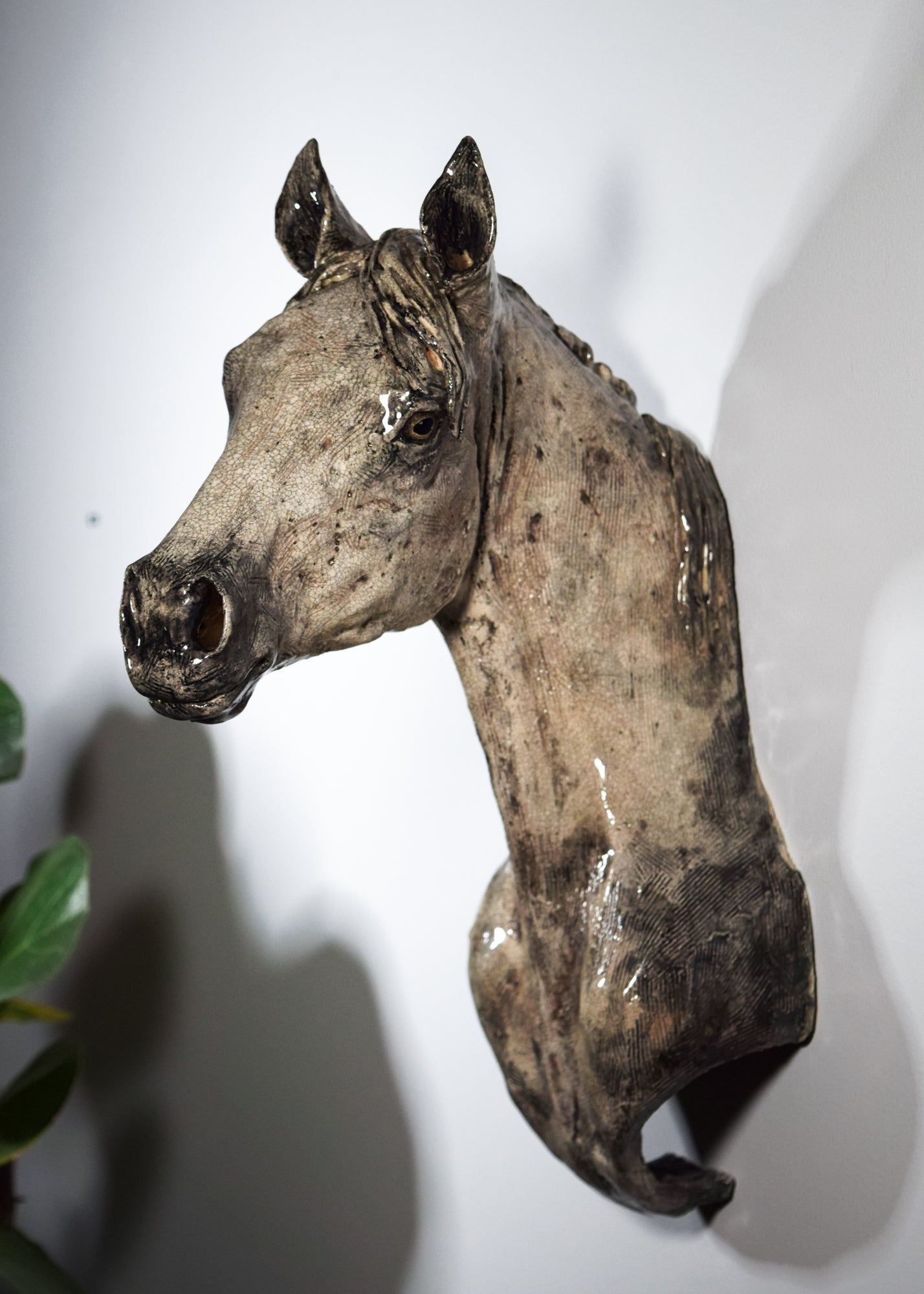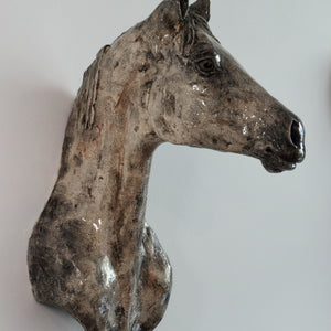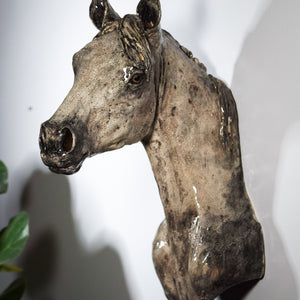 A wall-mounted ceramic horse bust that combines expressive sculpting and a history suggested by the crackled glaze. The surface makes the piece feel like something rediscovered - familiar, but touched by time. The grey horse has a calm and alert presence. Mounted on the wall, it becomes a quiet but commanding sculpture; meant to feel both elegant and grounded.